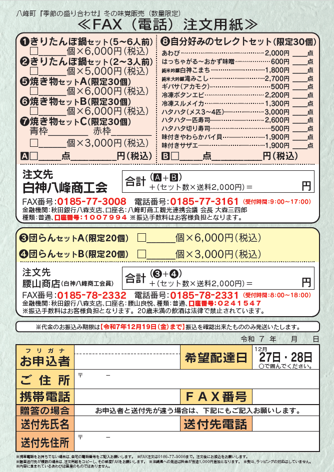 ①②⑤⑥⑦⑧: 白神八峰商工会 FAX:0185-77-3008 TEL:0185-77-3161(受付時間9:00~17:00)