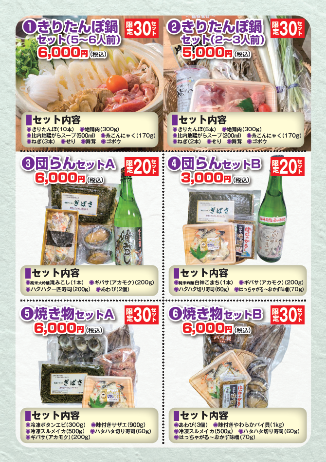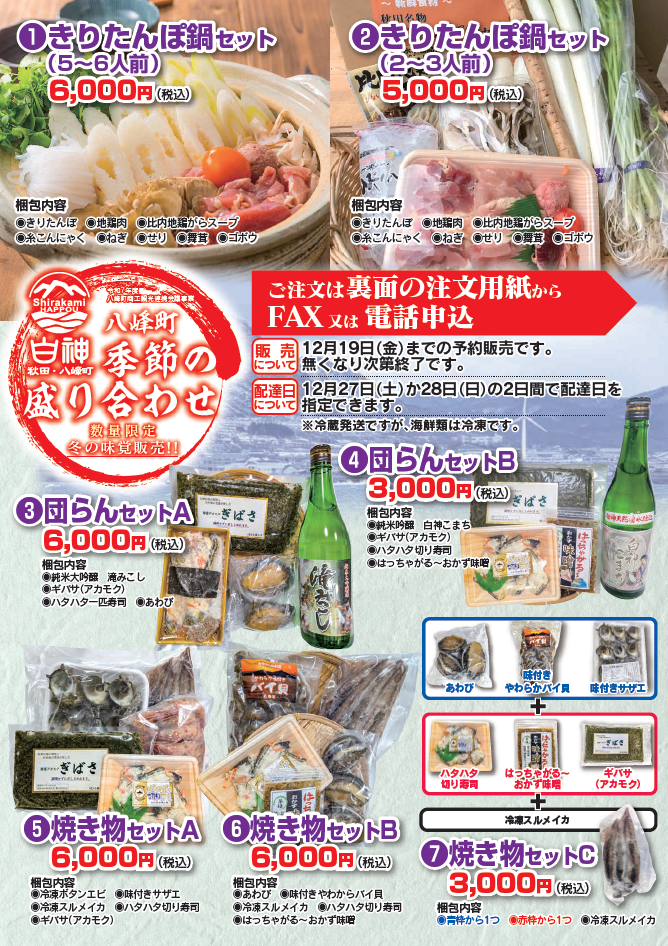 昨年に引き続き、商工会と観光協会の連携事業として、白神八峰商工会員事業者おすすめの品をまとめたセット商品を数量限定で販売いたします。