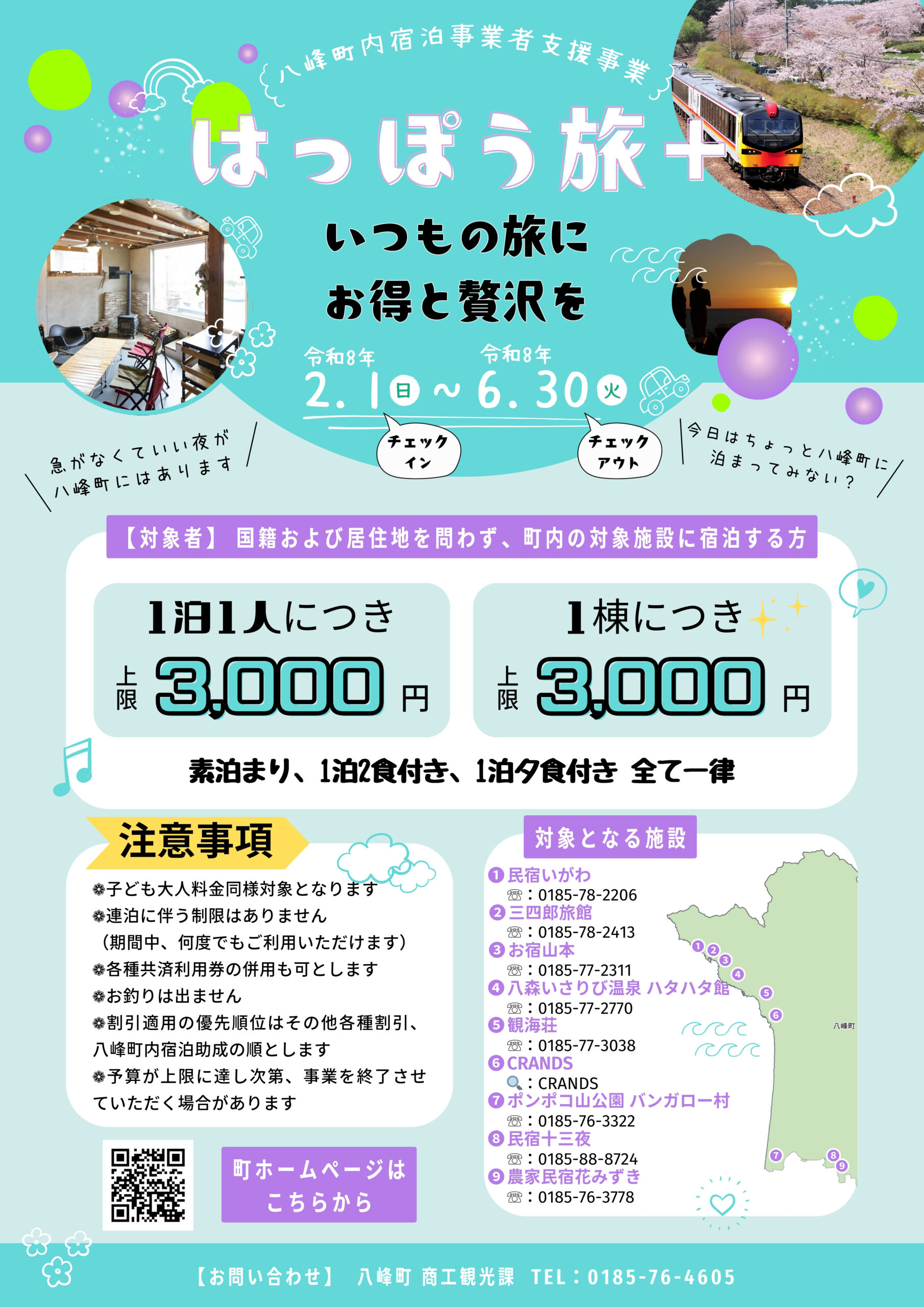 宿泊事業者への支援にくわえ、八峰町の宿にお得に泊まることができます。
